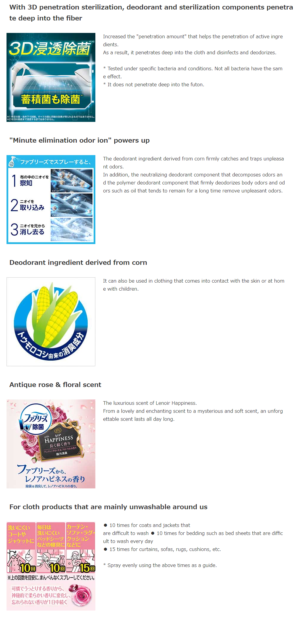 The scent of Lenoir Happiness from Febreze, a deodorant air freshener for cloth! Febreze deodorant and sterilize the luxurious scent of happiness that cannot be washed every day. The same scent as the popular fabric softener Lenoir Happiness lasts all day! A luxurious scent that is more than softener and less than perfume is slowly scented. Please use it for clothes and cloth products that are difficult to wash. Of course, it also has the same deodorant and sterilizing effects as conventional Febreze. The scent changes from a lovely and enchanting scent to a mysterious and soft scent that lasts all day long.